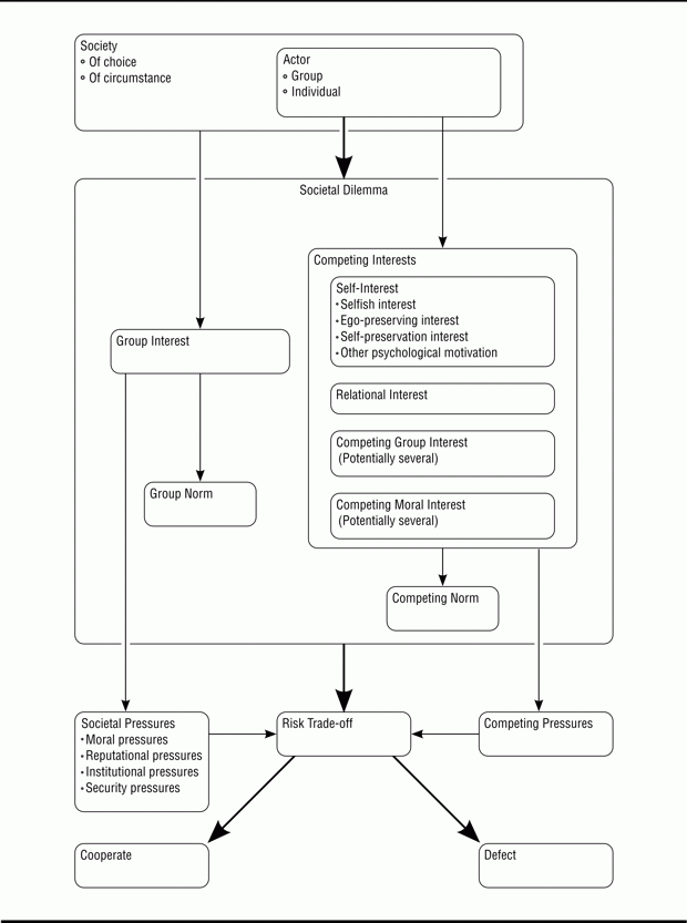 A societal dilemma is the choice every actor has to make between group interest and his or her competing interests. It’s the choice we make when we decide whether or not to follow the group norm. Those who do cooperate, and those who do not defect. Those are both loaded terms, but I mean them to refer only to the action as a result of the dilemma.